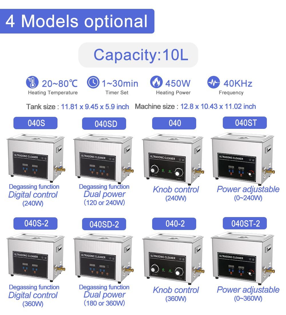 The CleaningSonic 040 Series represents the pinnacle of ultrasonic cleaning technology. Featuring a 10L extra large capacity industrial-grade tank equipped with up to 6 industrial transducers providing top-level 360W ultrasonic power. This series is specifically designed for challenging, high-volume professional cleaning scenarios, capable of processing numerous industrial parts or medical instruments simultaneously, significantly improving cleaning efficiency and production capacity.